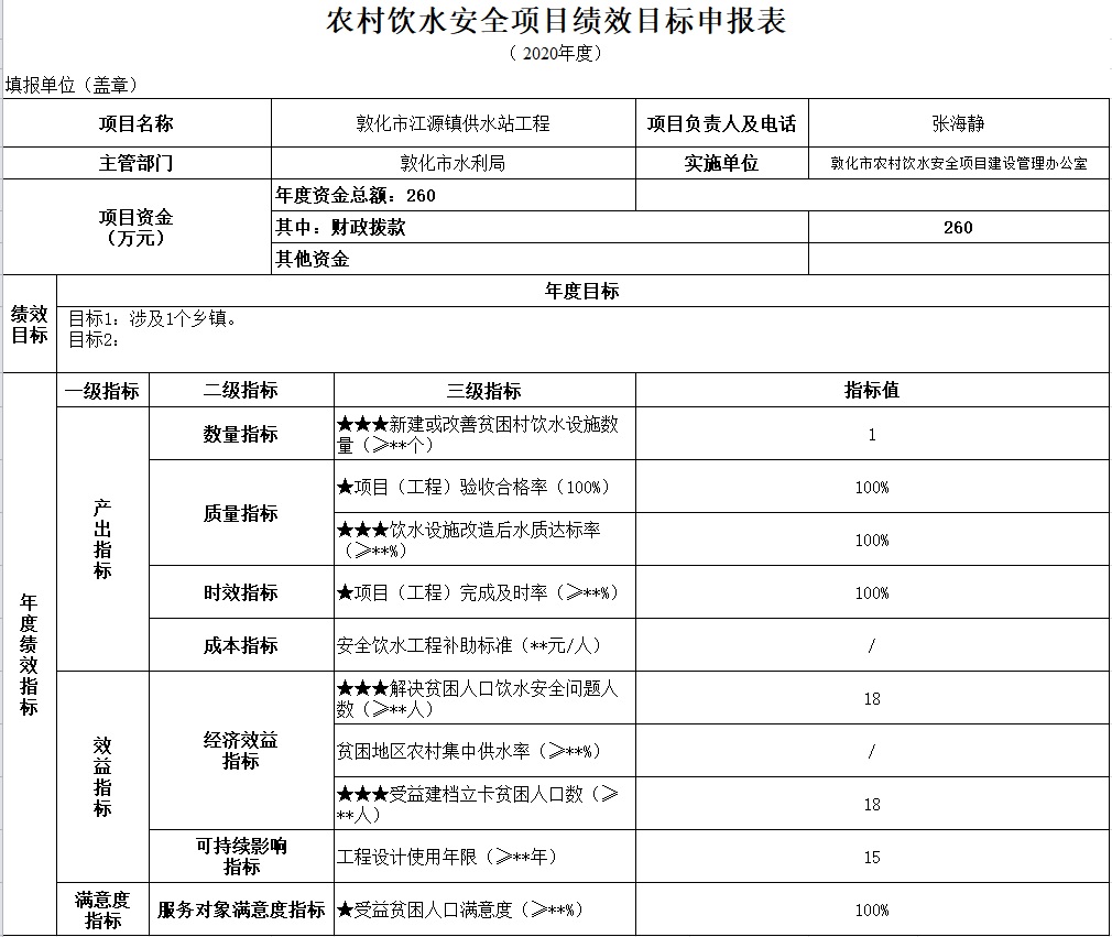 2020年完成1个乡镇农村饮水安全工程,解决3000人的农村饮水安全问题,其中建档立卡18人。