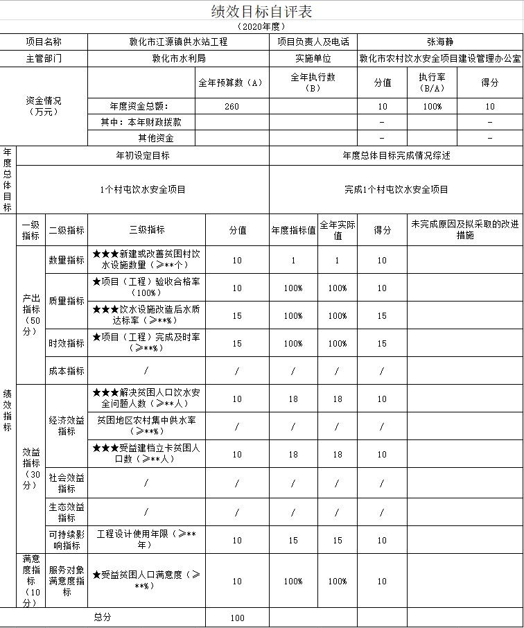 综上所述,敦化市江源镇供水站工程完成情况较好,实得分100分。